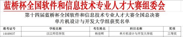 日前,第十四届“蓝桥杯”大赛全国总决赛成绩揭晓,bevitor伟德杨佳辉同学喜获电子类(单片机设计与开发大学组)三等奖的好成绩。