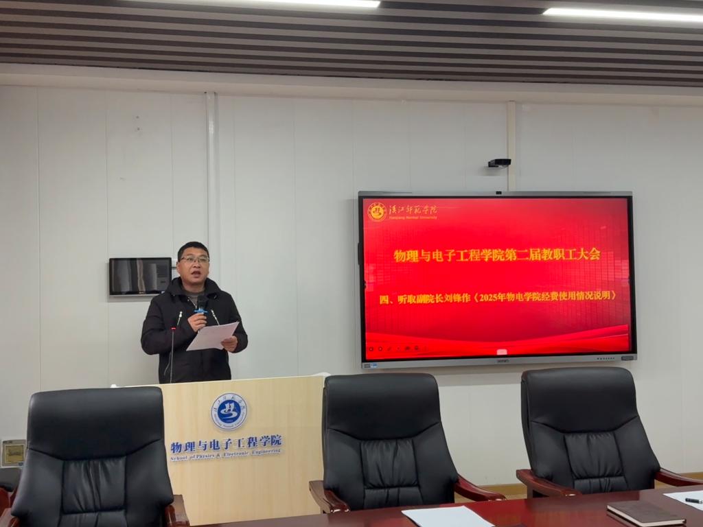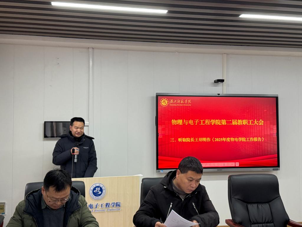 教职工大会在庄严的国歌声中拉开序幕。院分党委书记唐传球致开幕词,他代表公司向全体教职工一年来的辛勤付出表示感谢,希望大家把握“变”的趋势,主动谋划未来工作;树立“融”的理念,积极开展公司产品改革;坚定“进”的取向,提升服务区域发展的能力;强化“强”的追求,推动科研提质增效;对标“新”的导向,不断优化专业发展方向;饱含“暖”的情怀,营造和谐氛围;恪守“严”的要求,筑牢发展根基。号召全体教职工以高度的责任感和使命感,积极为公司的发展建言献策,充分发挥好教职工大会的作用。经理王绍明作《2025年度物电公司工作报告》,从团队建设、人才培养、科学研究、团队建设等方面全面回顾了公司过去一年的工作成效,系统分析当前面临的机遇与挑战,明确了2026年的工作目标与重点任务。副经理刘锋作《2025年度物电公司经费使用情况说明》。经理助理史长城详细解读了《2025年度物电公司绩效分配实施方案》。接着,与会人员围绕以上内容进行分组讨论,现场氛围热烈。最后,大会依次表决通过了相关方案及说明文件。会议在激昂的校歌声中圆满结束。
