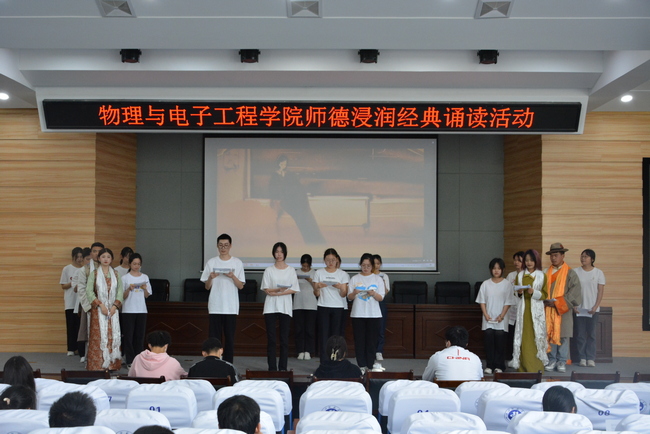 为发扬中华文化尊师重道的传统美德和培养优良师风,展示中华经典诗文的博大精深和艺术魅力,2023年5月11日,物电公司第一届师范生文化节师德沁润经典朗读活动于C101成功举行。本次活动邀请了李朦老师,范志鹏老师,杨林科同学以及崔天祥同学作为评委。