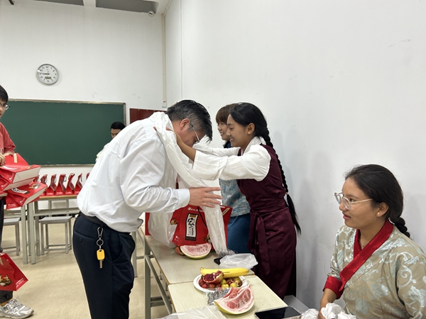 与会老师为在场同学送上了节日礼物,藏族同学也向老师们献上了洁白的哈达。
