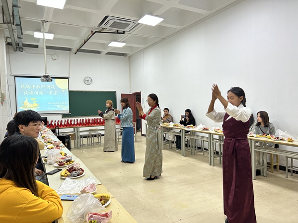 茶话会伊始,戴俊老师代表公司为同学们送上节日的问候。随后,藏族同学为在场师生献上《纳瓦吉瓦》、《益久措姆》、《幸福的藏家人》等极具民族特色的歌舞表演。