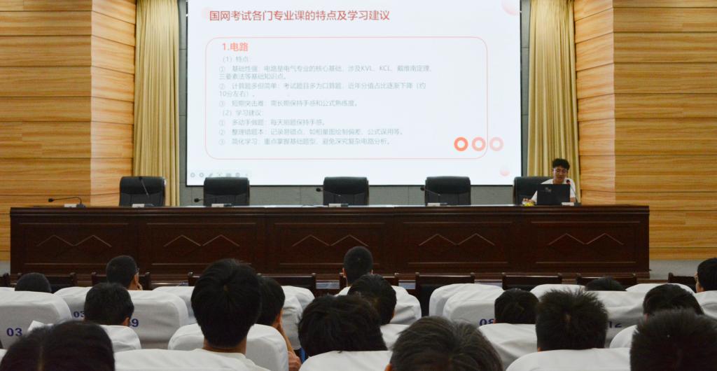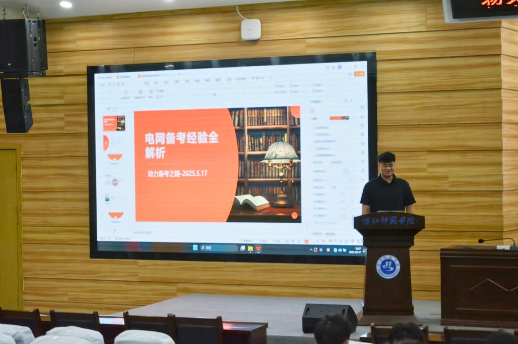接着,现就职于国网竹溪县供电公司的2023届员工范国林以“立足国网招考新趋势,系统拆解备考策略”为主题进行分享。他提出"3+1"复习模型,即三个月分阶段攻克电路原理、电力系统分析等核心科目,同步穿插行测专项训练,并现场演示了继电保护典型题型的解题思路。针对面试环节,他建议学子建立"专业认知+岗位匹配"应答框架,结合智能电网建设等前沿方向展现专业素养。